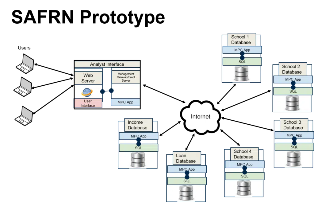 Generalizing from this vision, our SAFRN platform is designed to enable researchers to perform statistical analyses – including computation of moments and linear regression, with associated significance tests and goodness-of-fit measures – on sensitive data held by multiple parties, without leaking private information within that data to the researchers or between the data-owning parties. The researcher sends a proposed statistic to be computed, and the data owners (in the example above, the universities and a government entity supplying student financial data) participate in an MPC protocol, which consists of first a private set intersection to link the common identifiers in the records held by the parties, followed by a private aggregate computation on the linked data.